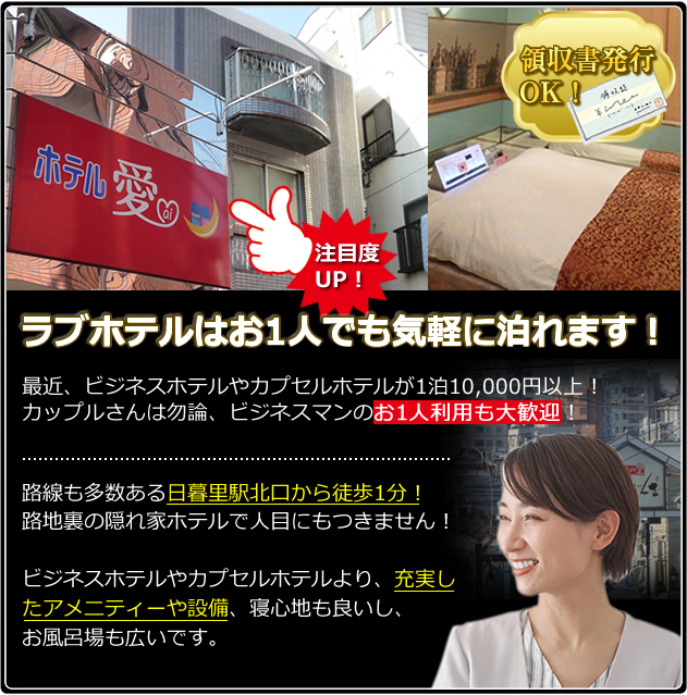 通常はファッションホテルとして利用するカップルが多いと言うイメージがあると思いますが現状は、出張のビジネスマンや女性同士(3人まで別途料金)でのご利用も増えてきております。
